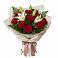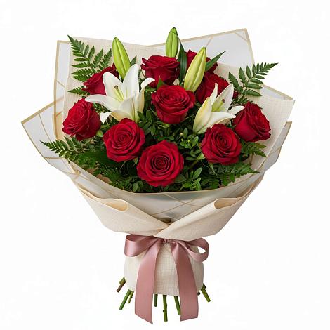 Этот изысканный букет сочетает в себе страстные алые розы и утончённые белоснежные лилии, дополненные свежей зеленью. Элегантная упаковка и стильная атласная лента подчёркивают роскошь и утонченность композиции. Такой букет идеально подойдет для выражения чувств, поздравления с праздником или особого случая, ведь он символизирует любовь, уважение и восхищение.